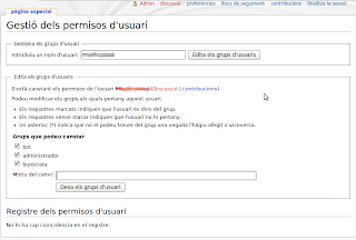 Un cop creat el compte, si tenim drets d’administrador podrem anar des de pàgines especials a “Gestió de permisos d’usuari”, on ens apareixerà un camp de cerca per buscar els usuaris que vulguem administrar.